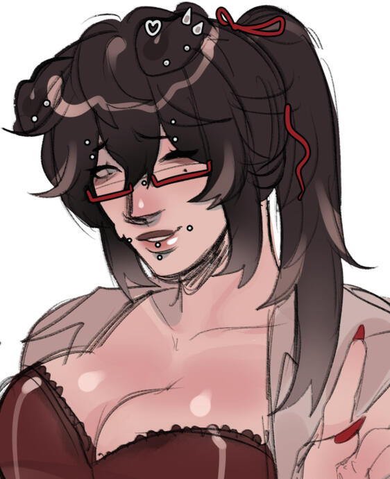 Batsugun, or simply Batsu for short, was born into this world knowing exactly what who they were supposed to be, and exactly what they were supposed to do. Upon emerging from the body pit, fully matured, and were granted a position in Hell's cutthroat sex industry as a brothel worker.They soon grew an insatiable lust for attention, always wanting to do more, to be more. The more eyes on them and them alone, the better they felt, so, they naturally gravitated toward an industry that was less overcrowded, one where they could be the star of the show. Their niche ended up being snuff films. They would allow themselves to be tormented and slaughtered, again and again, for hundreds of eyes to see. Their reputation was largely negative, with even the scum of Hell viewing their actions as "too far" in certain cases, but they didn't care. All they wanted was to be seen. To be known.They told themselves they were fine, but they were not. When they finally started to break down, unable to keep it together any longer, they were in too deep, bound by contracts, connections, and exceptions. They couldn't leave, but they couldn't stay, either. Eventually, they had a complete breakdown and fled the spotlight, ditching their old life and retreating into the underpopulated fringes of Hell.Traumatized and repulsed, they became somewhat of a social recluse. Eventually, they began to allow themselves to be summoned by mortals through ritualistic sacrifice, to which she would then to their bidding. Unfortunately, this wasn't too different from her life as a sex worker, but at least her endeavors weren't being broadcasted for all to see.